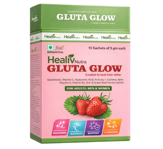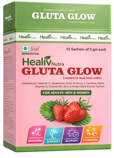 Healiv Nutra Gluta Glow is a therapeutic antioxidant formulation developed to support skin clarity, cellular defense, and overall skin health from within. Powered by clinically relevant ingredients, it helps combat oxidative stress, supports collagen integrity, and promotes a healthy, radiant appearance—without exaggerated claims or unnecessary additives.
